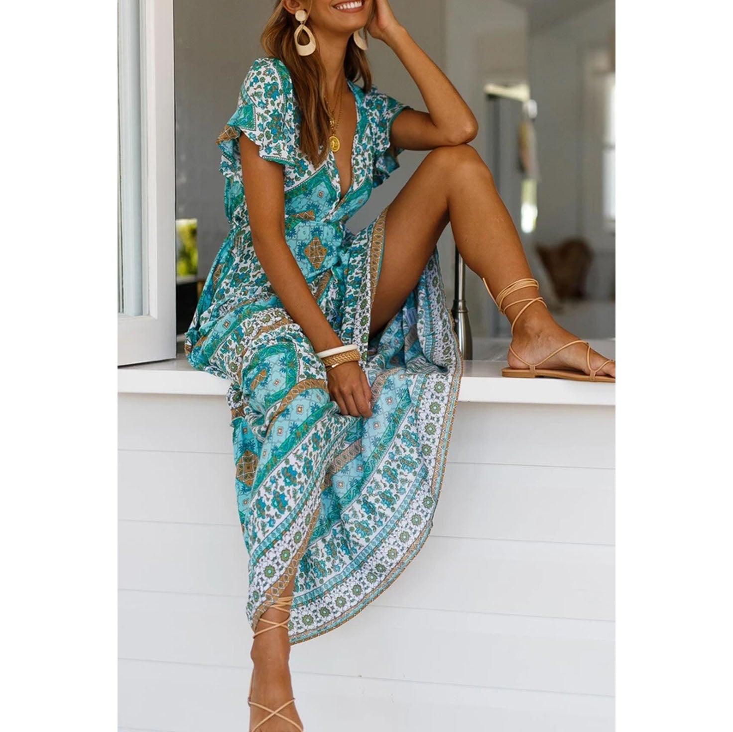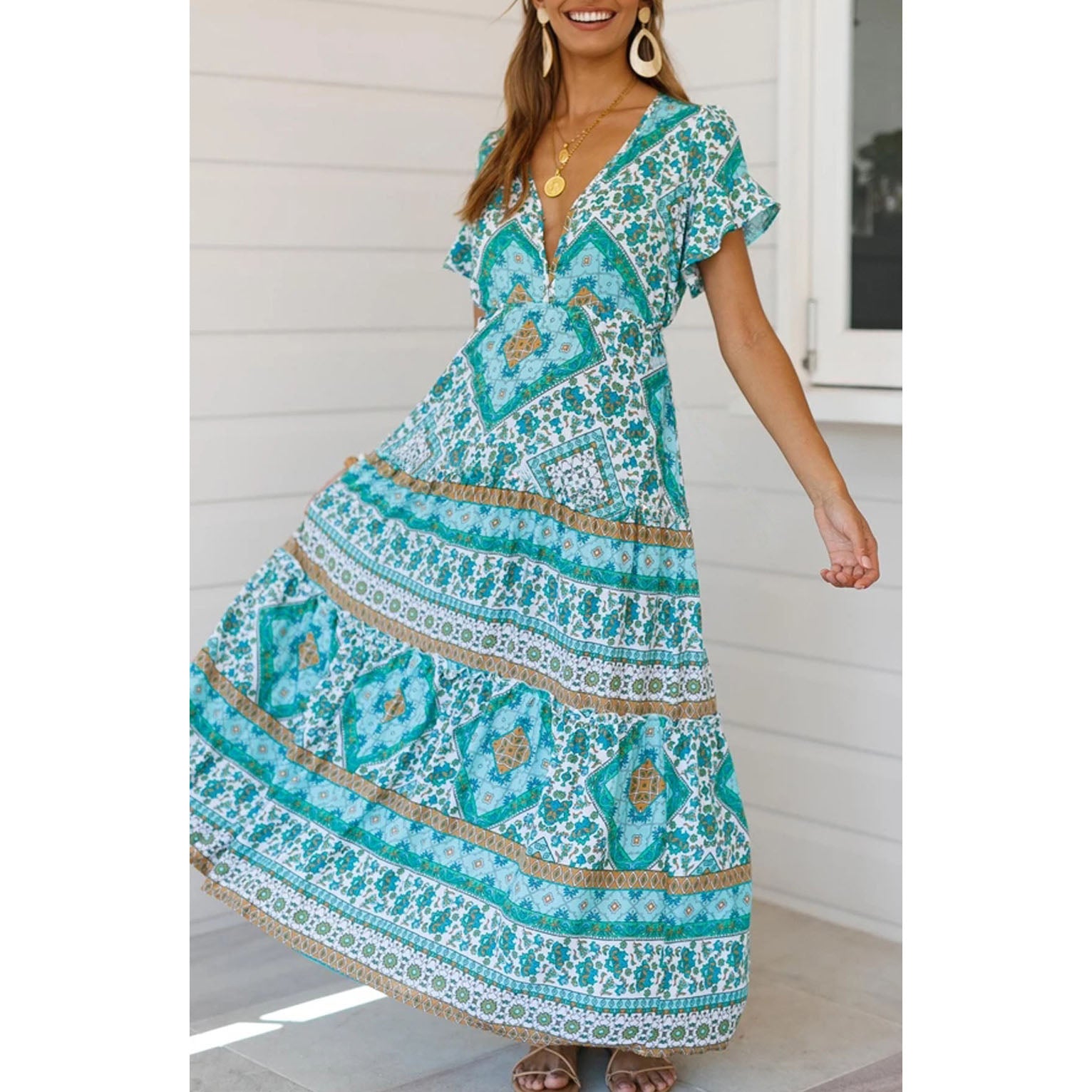 Vintage V-Neck Printed Maxi Dress