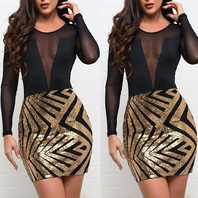 Round Neck Stitching Sequins Wrapped Hip Bodycon Dress