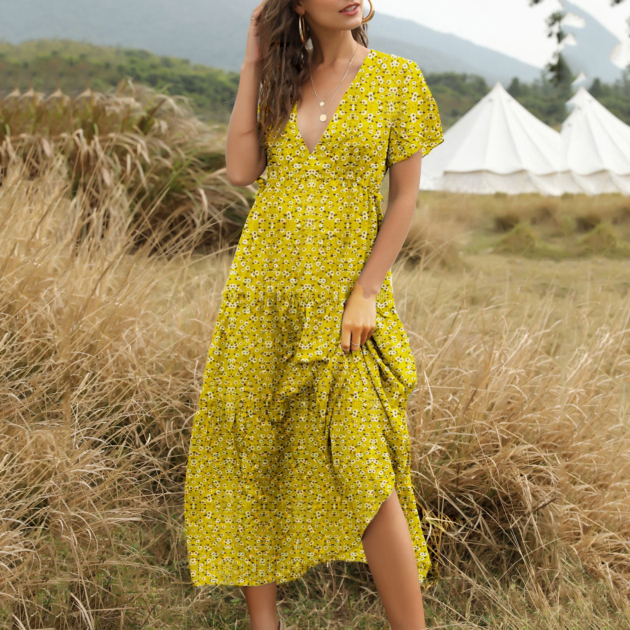 Elegnat V-Neck Short Sleeve Floral Printed Maxi Dress