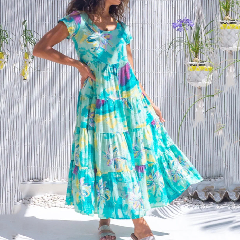 Printed Short Sleeve Stitching High Waist Maxi Dress