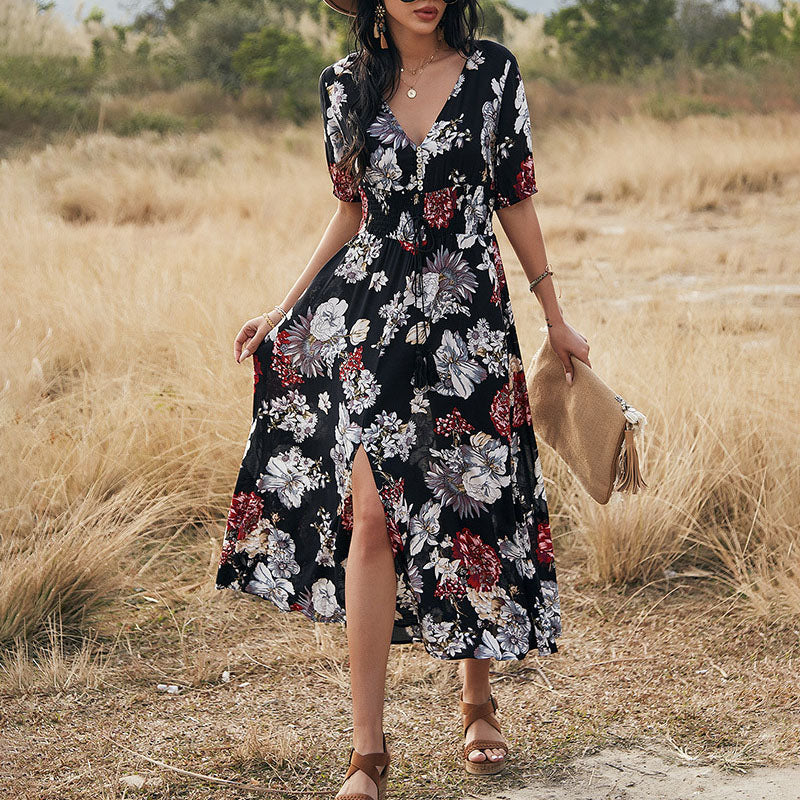Elegant V-Neck Floarl Printed Short Sleeve Maxi Dress