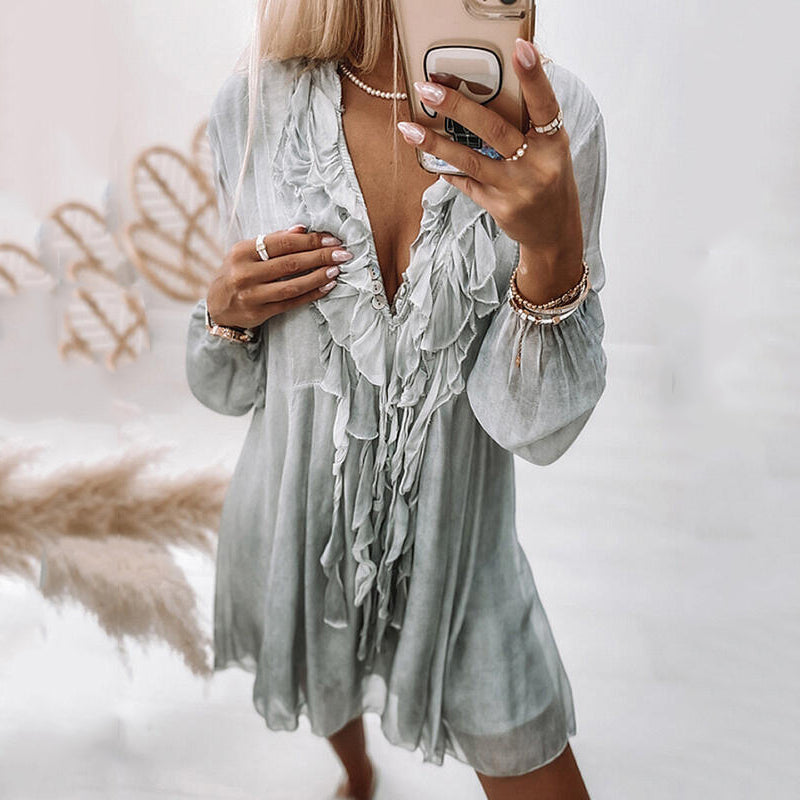 V-Neck Lapel Long Sleeve Mini Dress