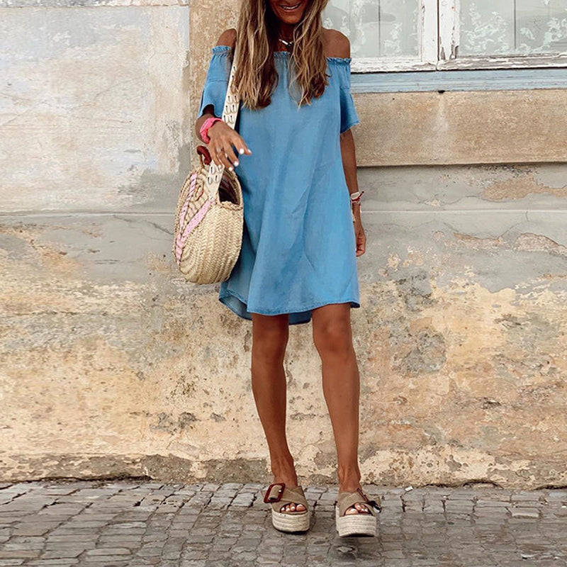 • Load image into Gallery viewer, Elegant Off Shoulder Denim Mini Dress